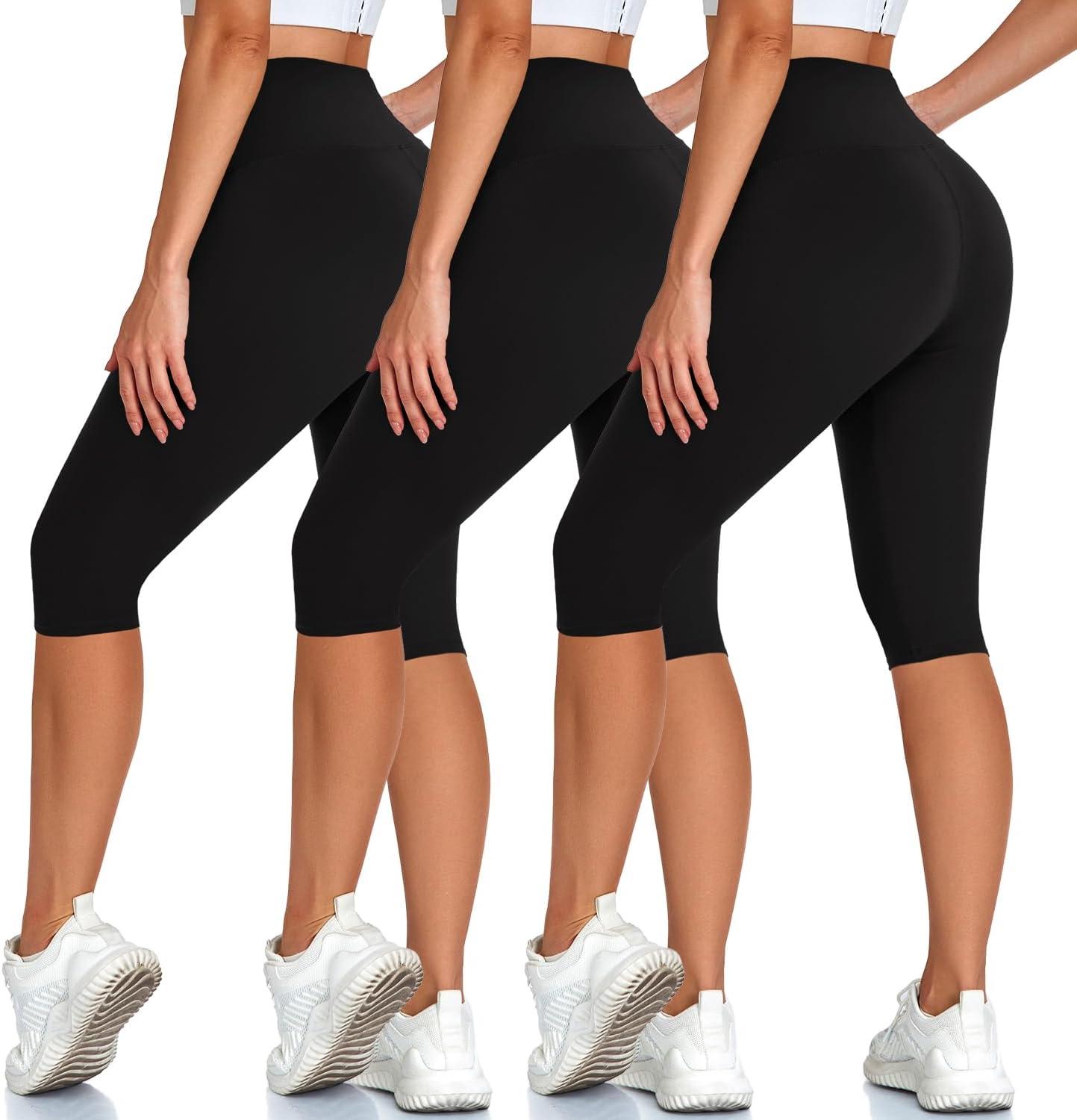 High Waisted 3 Pack Women’s Capri Pants – Knee Length Yoga Shorts, Biker Workout Leggings for Women,Summer Activewear(Black/Black/Black)